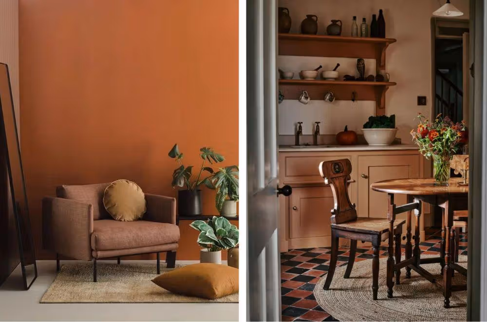 Kombinasi warna ini cocok untuk kamu yang suka kesan earthy dan natural. Caramel yang hangat akan sangat menyatu dengan hijau olive yang tenang. Dalam interior, perpaduan ini menciptakan suasana sejuk namun tetap hangat, sangat ideal untuk ruang keluarga atau sudut baca favoritmu.
